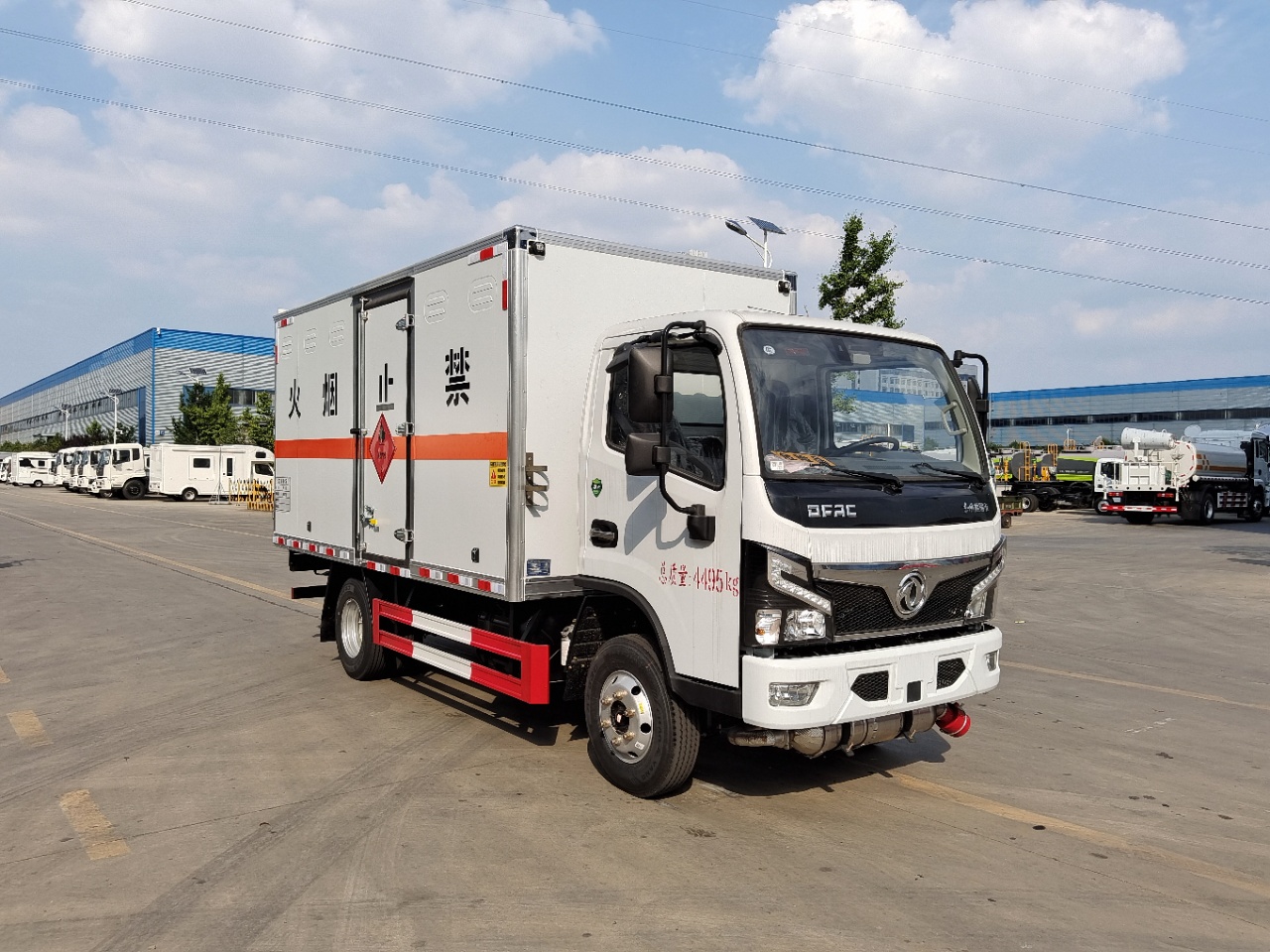 | 貨箱配置 | 廂體為雙層金屬骨架結構,外板采用冷軋鋼板,中間填充阻燃泡沫,內飾為鋁板。底板為平板上鋪防靜電膠皮。廂內兩側加裝固定貨物臥環,門框帶防盜報警器,頂部帶煙霧報警器,廂體右側選裝側門,隨車配2個滅火器,危險標志牌,防火帽,危險品三角頂燈。(也可用瓦楞板) | ||