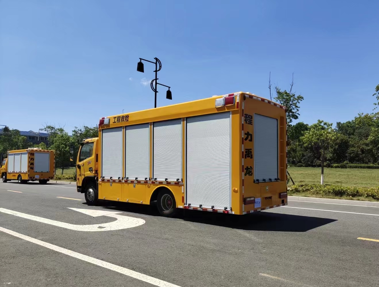 | 上裝配置 | 1、廂體外形尺寸根據(jù)實(shí)際公告標(biāo)準(zhǔn)。 廂體:具備運(yùn)輸、防雨、防火、阻燃、防塵、防銹、降燥,隔震、長期抗震結(jié)構(gòu)。外部鋼材為優(yōu)質(zhì)冷軋鋼板,表面處理平整,內(nèi)襯優(yōu)質(zhì)冷軋鋼板折彎骨架,強(qiáng)度牢固,配重合理。 2、廂體一體化鋼體結(jié)構(gòu)設(shè)計(jì), 頂部平坦。廂體采用骨架式夾層形式,外蒙皮采用厚1.5mm優(yōu)質(zhì)防銹處理的汽車專用冷軋鋼板,中間骨架采用防銹處理后的鋼管焊接,頂層、側(cè)圍內(nèi)、外層之間填充長時(shí)間使用對(duì)人體無害的防火阻燃環(huán)保吸音棉,外層鋪蓋一層阻燃金屬布,內(nèi)飾采用0.8mm厚網(wǎng)孔板。底板采用鋼結(jié)構(gòu)底框架,上表面鋪厚2mm花紋鋼板。 3、車輛廂體采用整體包覆式,廂體兩側(cè)下部設(shè)置裙邊式,全封閉式結(jié)構(gòu),頂部為圓弧型,尾部有轉(zhuǎn)向燈、剎車燈、尾燈、霧燈,箱體表面光滑平整。車廂靠駕駛室前部為休息室,休息室內(nèi)帶折疊坐椅及折疊桌,往后為機(jī)組室,機(jī)組室左、右側(cè)布置進(jìn)排風(fēng)百窗,設(shè)置機(jī)組檢修門一個(gè),下置登車踏步梯,車廂后端為后為卷簾門。右側(cè)排風(fēng)百葉窗下部為維修觀察艙門。左側(cè)下圍設(shè)置有工具箱及功能艙門等。右側(cè)下圍設(shè)置有汽車油箱艙、液壓控制艙等。 4、車廂尾部配置標(biāo)準(zhǔn)儲(chǔ)物貨架讓出水帶、加長電纜等附件存放有序、互不干涉,讓緊急排水搶險(xiǎn)變得更加快捷、有效。 5、廂體噴漆:工程黃,與車頭同一顏色; 6、最終的門數(shù),形式,打開方式嚴(yán)格按照合同要求依據(jù)程力公告生產(chǎn); | ||