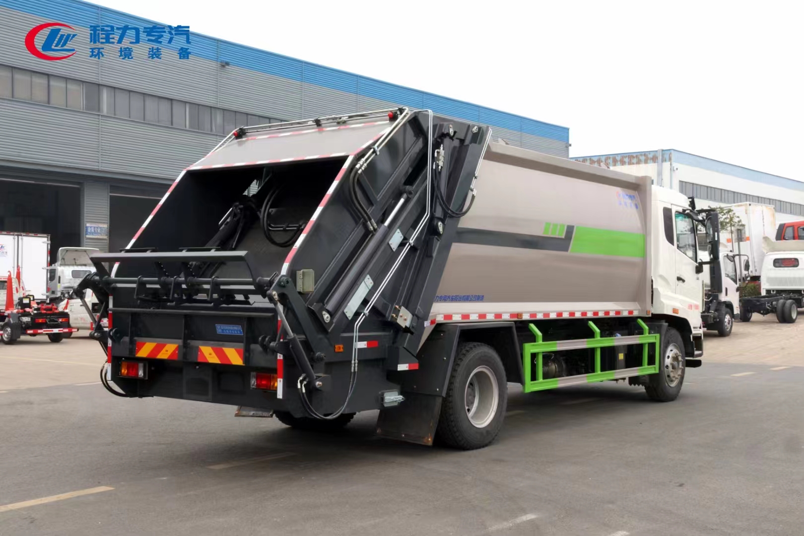 | 上裝配置 | 上裝為弧形箱體結(jié)構(gòu),采用Q345(局部采用T710)高強(qiáng)度板制作。有效容積15-18立方,采用中梅大通徑五聯(lián)手氣一體多路閥,全系標(biāo)配背壓閥(增加雙向壓縮比),合資鐵殼液壓齒輪泵,嘉善取力器,中梅手氣一體多路閥,恒力油缸(質(zhì)保兩年),加強(qiáng)型掛捅后翻轉(zhuǎn)機(jī)構(gòu)(可選裝三角斗、全密封斗、擺臂等翻轉(zhuǎn)機(jī)構(gòu)),外置滑板缸結(jié)構(gòu)設(shè)計,石墨烯尼龍滑塊,長沙福力CAN總線控制系統(tǒng),尾部帶有硅膠控制面板,標(biāo)配無線遙控,帶光電感應(yīng)保護(hù)裝置,標(biāo)配后污水箱,(中聯(lián)樣式雙排污口),可加裝側(cè)邊污水箱。加裝氣動密封蓋。 | ||