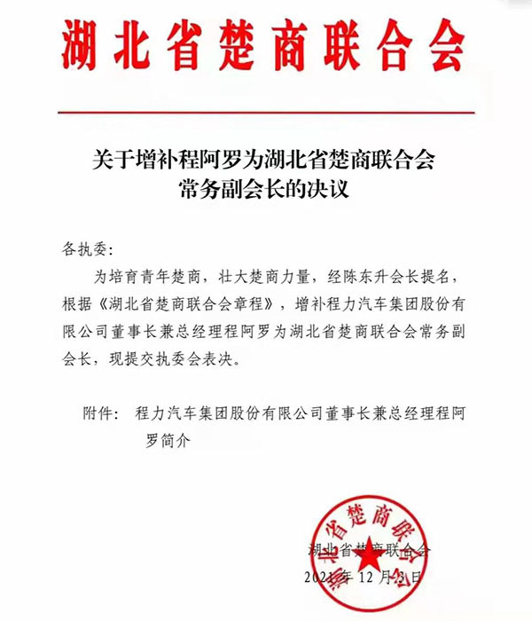 “虎威熠熠踏征程,八面來風共聚首”,程阿羅總經理作為省青企聯會長暨湖北省楚商聯合會常務副會長,由于其掌舵的程力汽車集團在中國專汽行業所作出的突出貢獻,特別是2021年在疫情反復肆掠,各種自然災害和國際國內市場震蕩低迷等不確定因素疊加效應影響下,程力集團萬眾一心攻堅克難,全年完成87億專汽產值,仍保持了2位數的百分比增幅,在全省“緩復蘇、補損失”的大環境下,保持了穩健的發展勢頭,應邀出席了湖北省年度經濟工作會議,聆聽了湖北省委應勇書記和王忠林省長的發言和工作報告,積極為湖北經濟發展建言獻策。